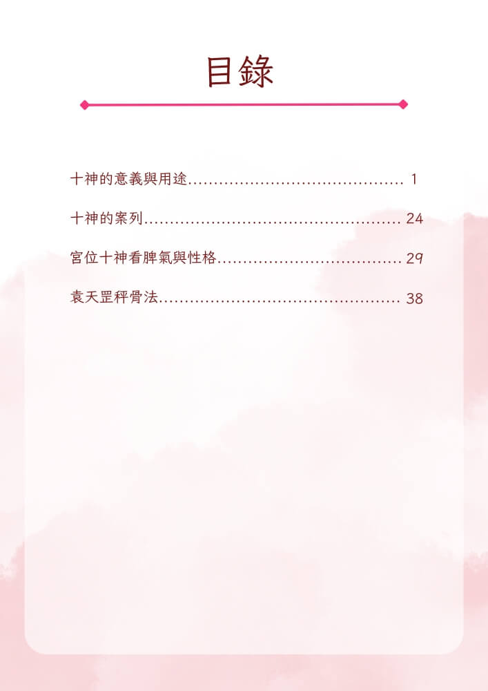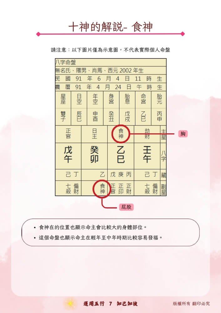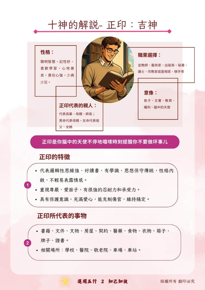 深入掌握八字十神體系,能準確說明各個十神所代表的人生命題,並靈活運用十神來剖析命盤的重點與細節。