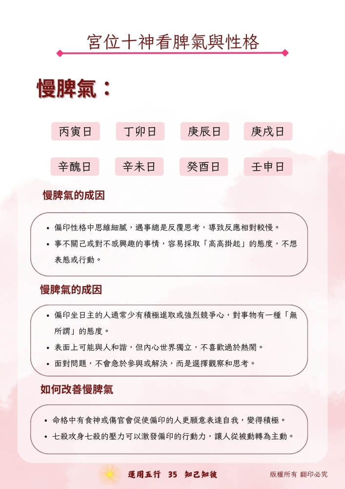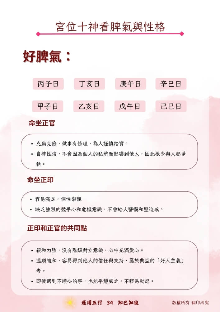 | 宮位十神看脾氣性格 | 日支比肩:倔脾氣 日支劫財:倔脾氣 日支正財:好脾氣 日支正官:好脾氣 日支正印:好脾氣 日支傷官:急脾氣 日支食神:急脾氣 日支七殺:爆脾氣 日支偏印:慢脾氣 |