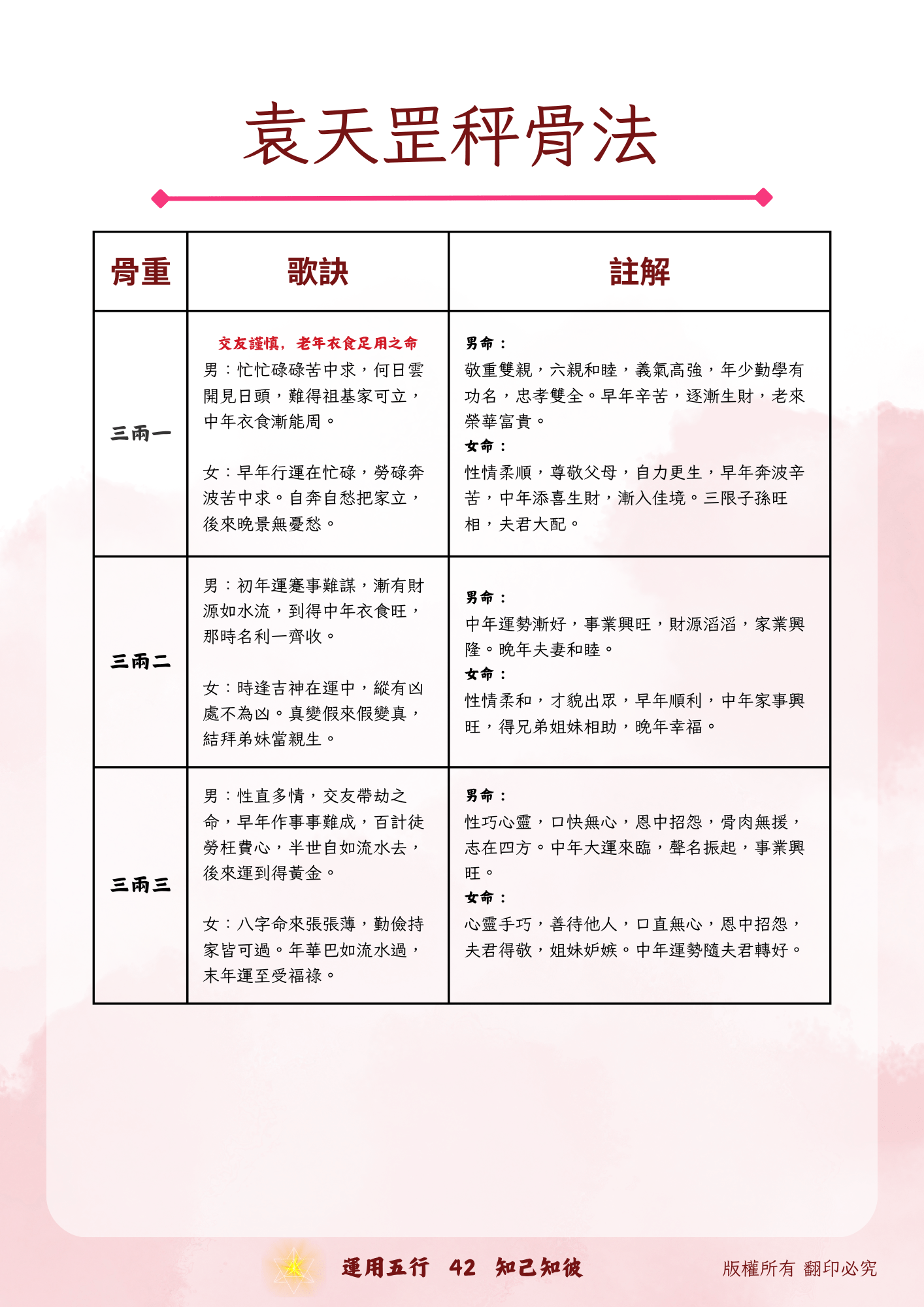 學習運用傳統秘法袁天罡秤骨法進行快速命格評估:掌握骨重計算方法,理解重量數值背後蘊含的命運詩偈,將之與八字命盤印證比較,加深對命運的多角度體會。