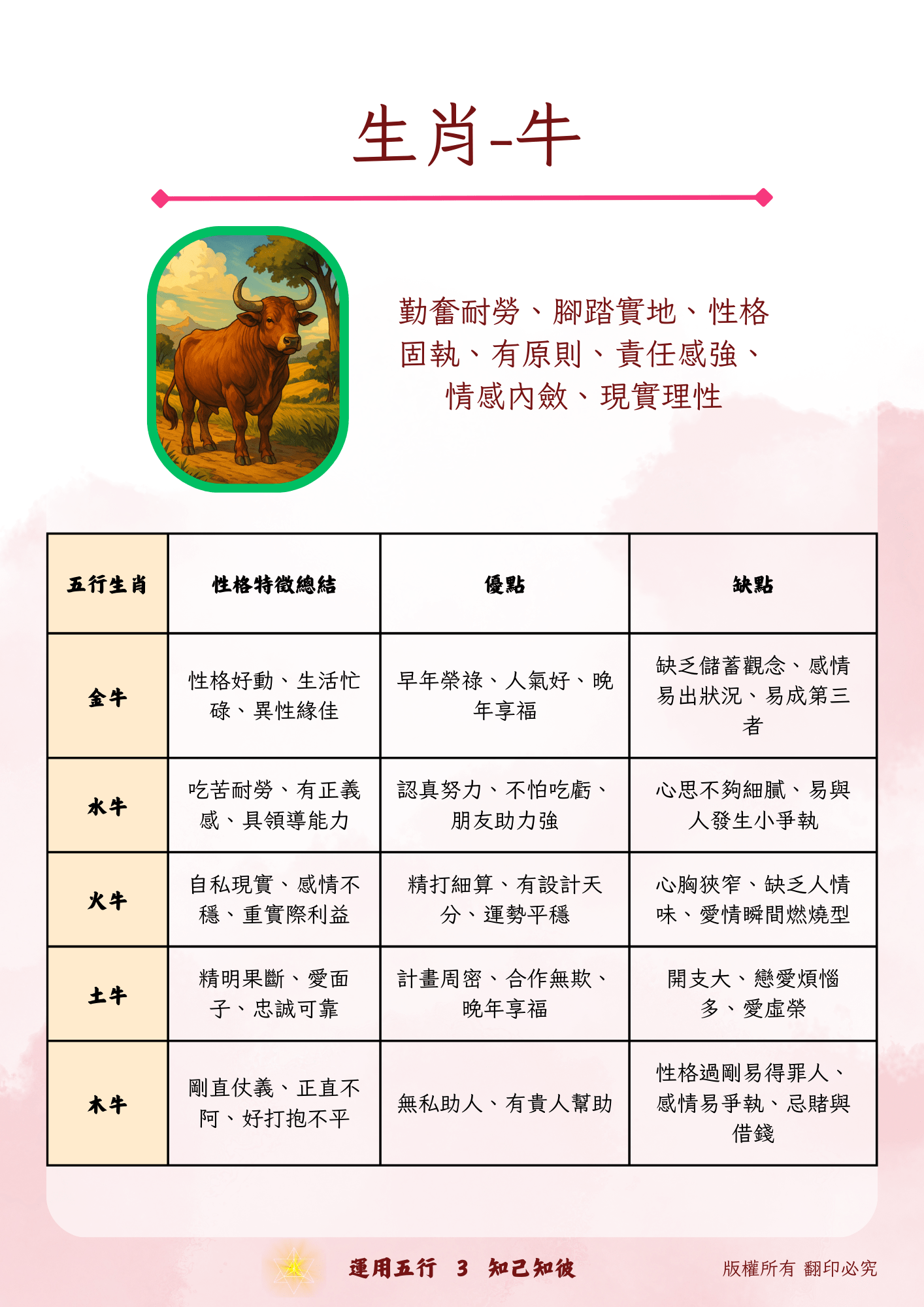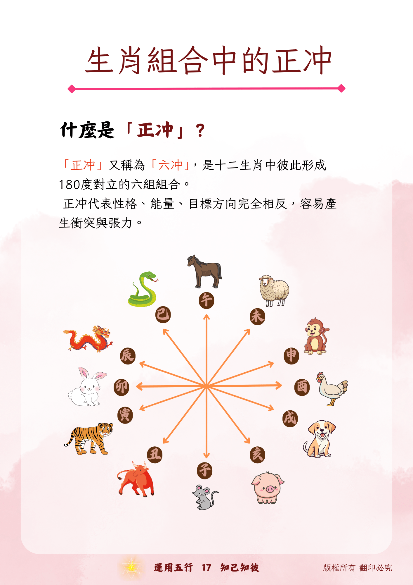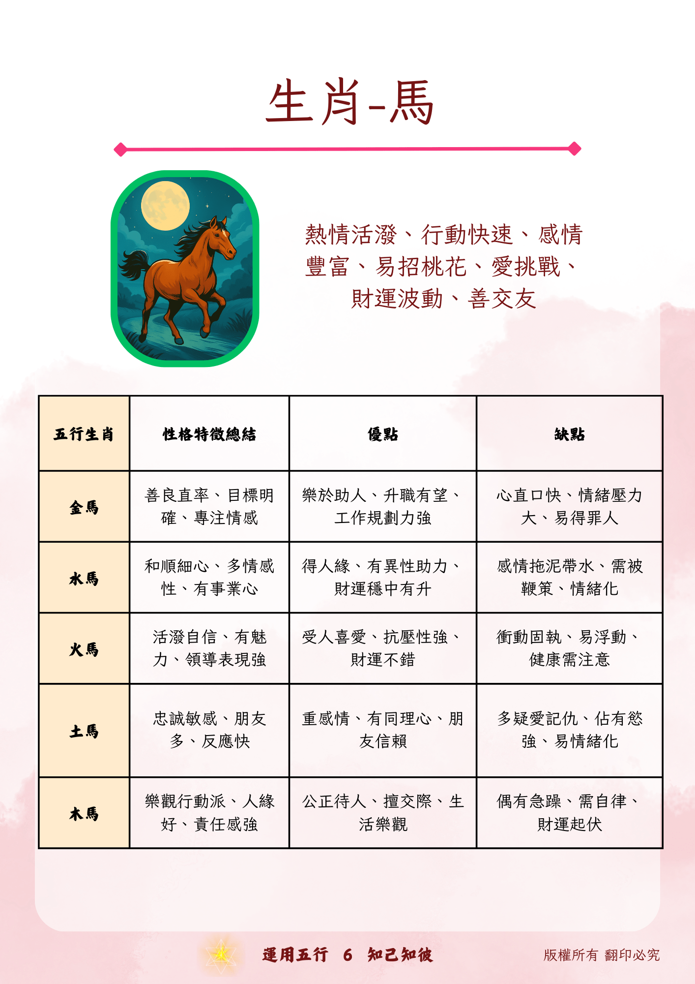 全面掌握十二生肖在五行(金、木、水、火、土)中的性格特質、優勢與弱點,並能根據生肖與五行能量推斷個人行為模式與人際互動特質。