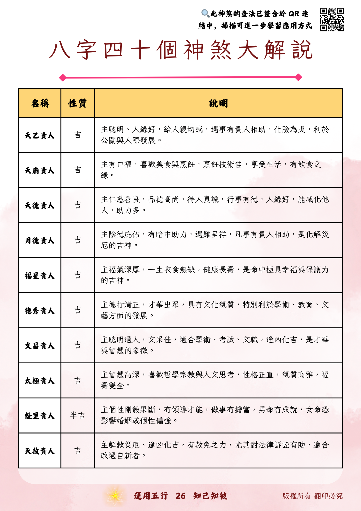 最後,進入 四十大神煞精解,逐一解析各神煞的象徵意義與實際應用,並透過多案例演練加深記憶。例如「天德貴人」代表仁慈助人,適合慈善、教育行業;「將星」象徵領導力與威望,容易在團隊或社會中擔任重要角色。