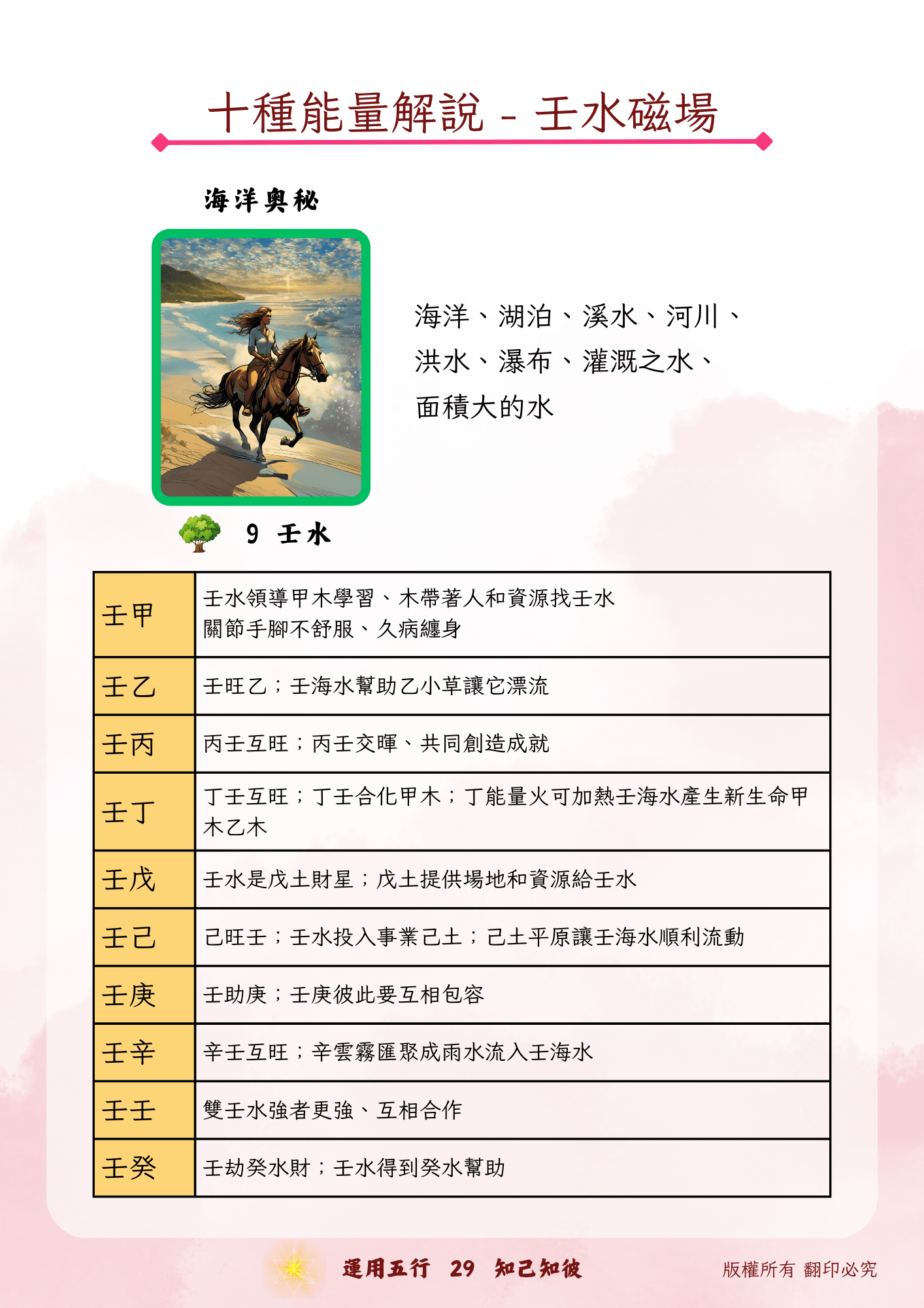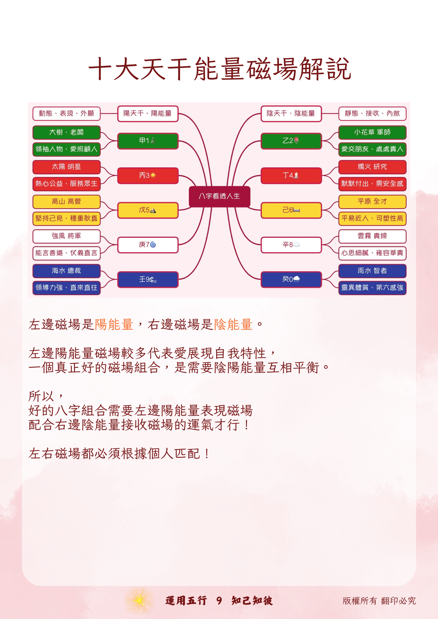 | 十大五行分別的代表物 | 甲木:樹木 講師 教書 領導 壬水:海洋 財務、行動力強、機巧、靈敏 辛金:剪刀 果實 貴婦 雲霧 |