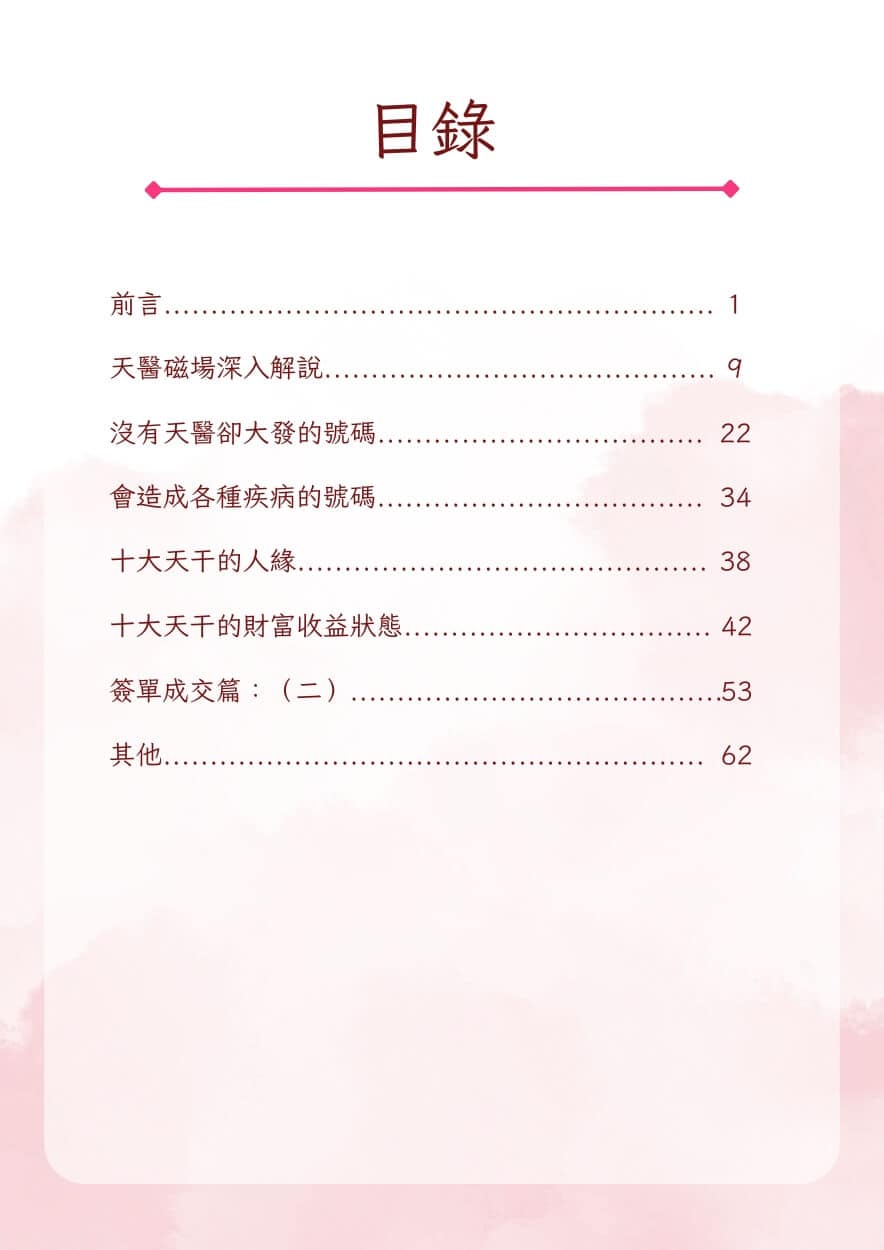 | 天醫:霸道總裁 穩定獲利 天醫:傻人有傻福的號碼 天醫:另一半為你花錢 天醫:來自四面八方的錢財 | |