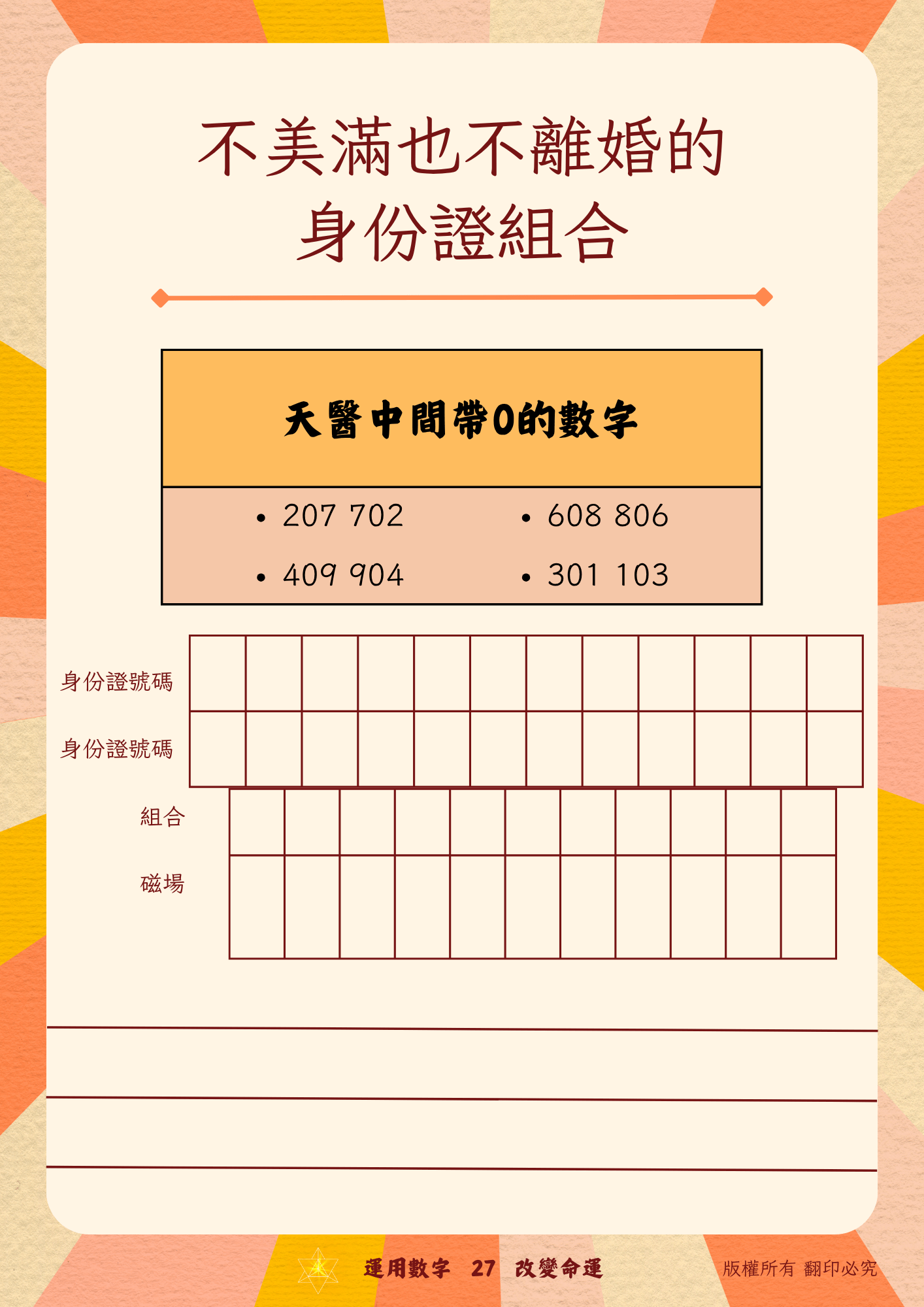 婚姻關係洞察: 從數字組合中預測婚姻與感情狀態,包含解析哪些數字能量組合的人較容易遭遇婚姻變動(如分離或摩擦),哪些組合預示婚姻美滿穩定。課程中將分享如何由身分證號碼看出感情模式,提供您在人際關係上的寶貴參考。