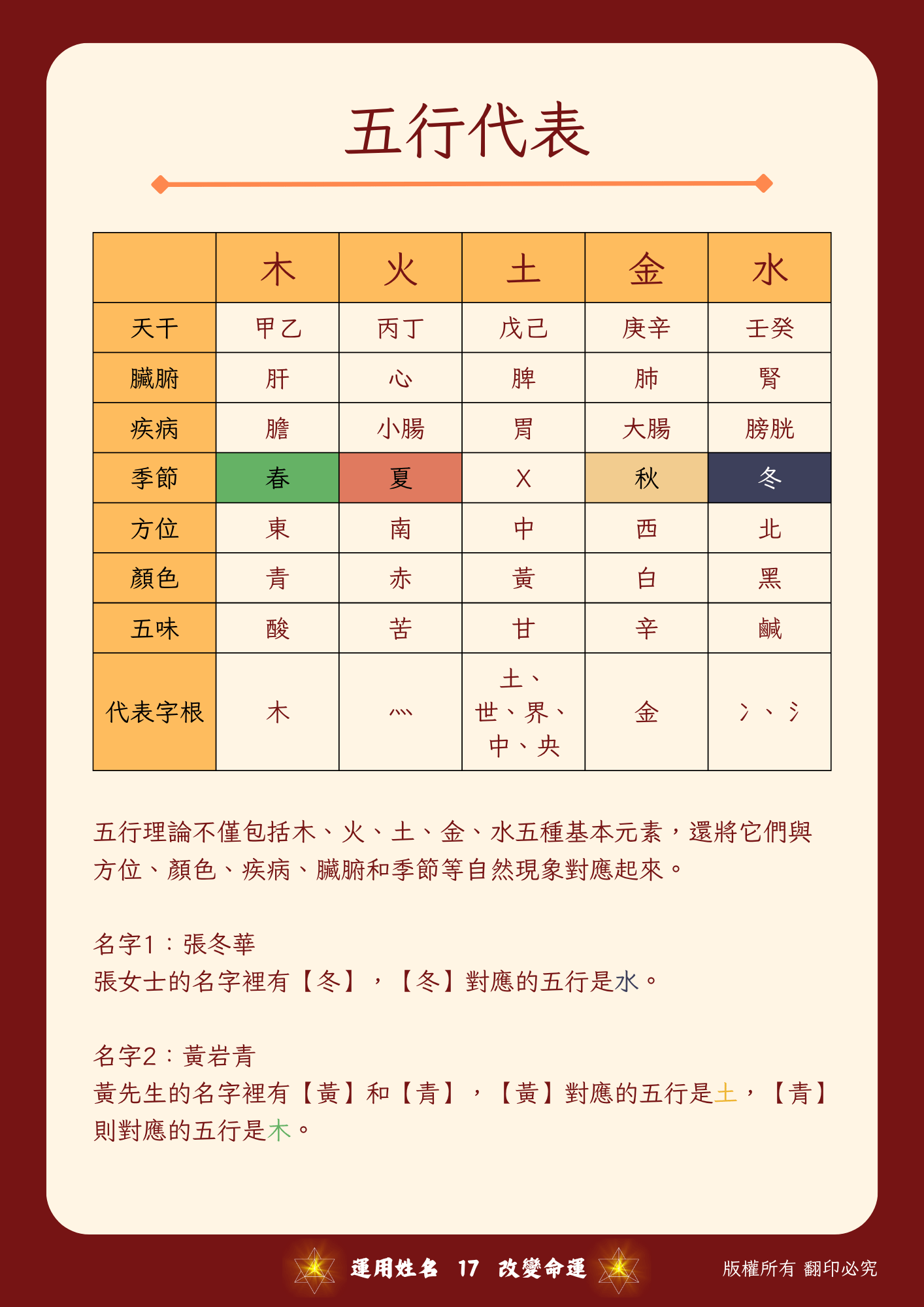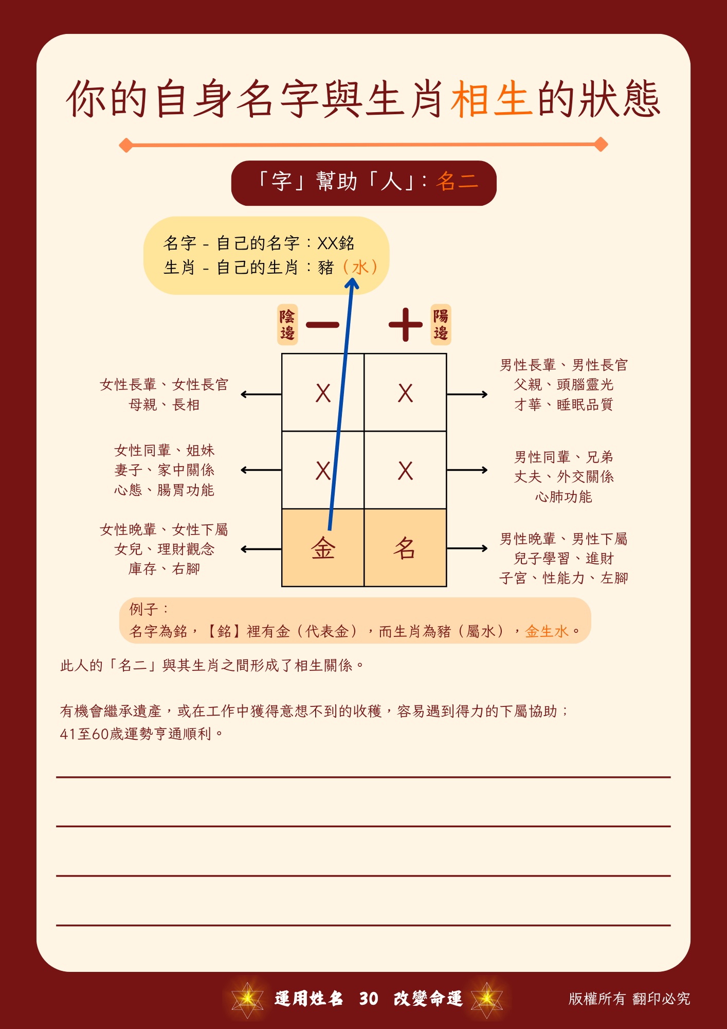 例:名二的五行是水,幫助你的生肖五行,你賺錢很輕鬆。