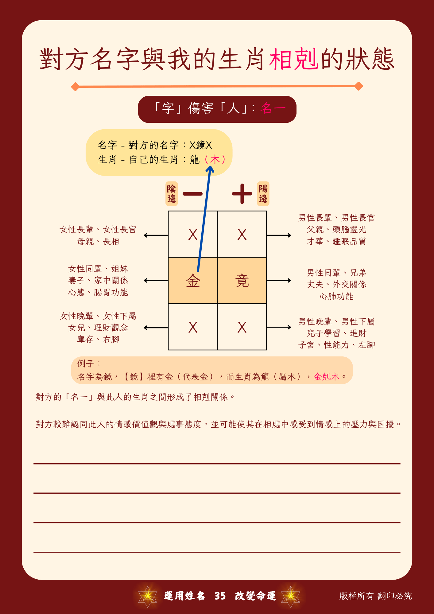 - 名二(人幫字例子):容易頻尿、容易流產、花錢大方、容易溢價、付出財富給予子女、41-60付出格局